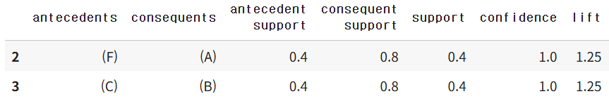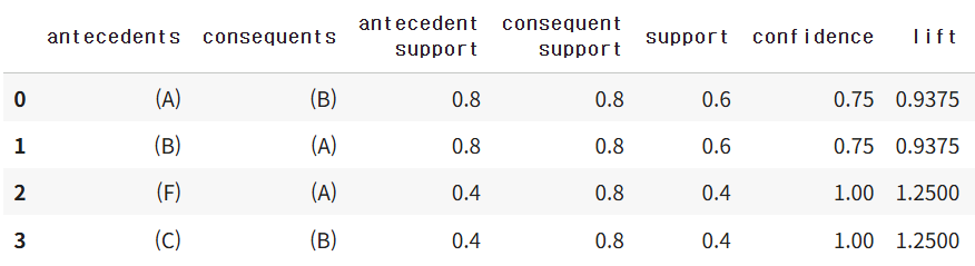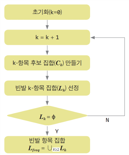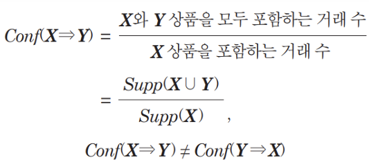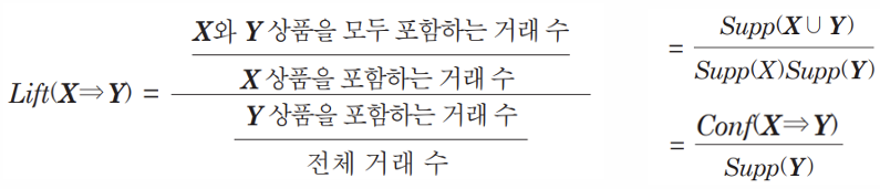 * 최종적으로 2항목 이상의 빈발 항목 집합에 대한신뢰도와 리프트를 구하여 연관규칙을 발견한다.